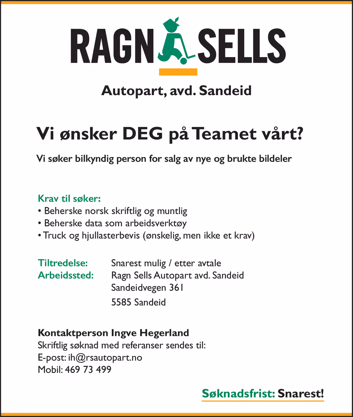 Vi søker bilkyndig person for salg av nye og brukte bildeler Krav til søker: • Beherske norsk skriftlig og muntlig • Beherske data som arbeidsverktøy • Truck og hjullasterbevis (ønskelig, men ikke et krav) Tiltredelse: Snarest mulig / etter avtale Arbeidssted: Ragn Sells Autopart avd. Sandeid