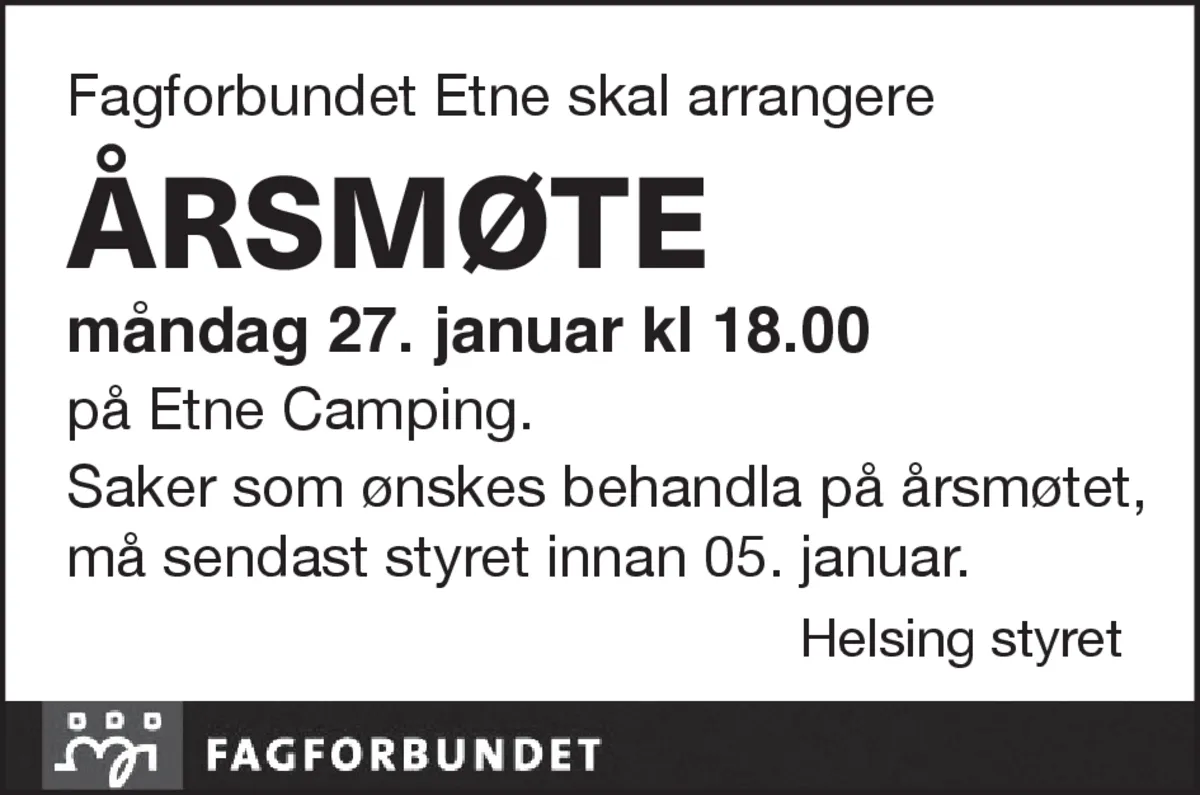 Fagforbundet Etne skal arrangere årsmøte. Saker som ønskes behandla på årsmøtet, må sendast styret innan 5. januar.