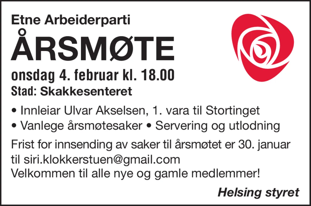 Innleiar Ulvar Akselsen, 1. vara til Stortinget Vanlege årsmøtesaker Servering og utlodning Frist for innsending av saker til årsmøtet er 30. januar til siri.klokkerstuen@gmail.com Velkommen til alle nye og gamle medlemmer!
