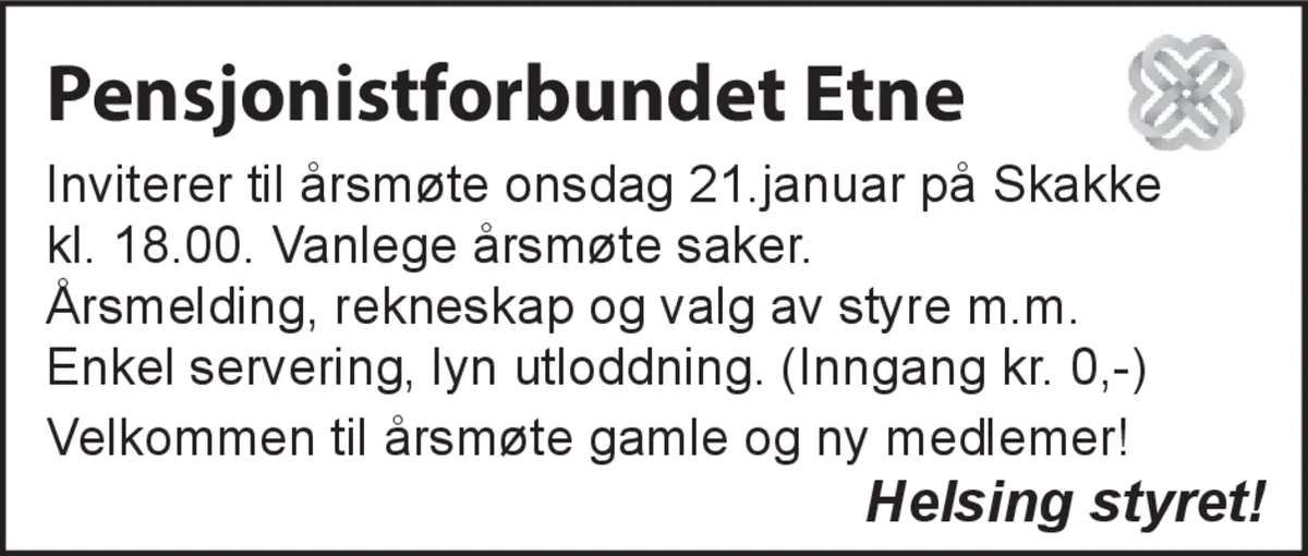 Inviterer til årsmøte onsdag 21. januar på Skakke kl. 18.00. Vanlege årsmøte saker. Årsmelding, rekneskap og valg av styre m.m. Enkel servering, lynn utloddning. (Inngang kr. 0,-) Velkommen til årsmøte gamle og ny medlemer!