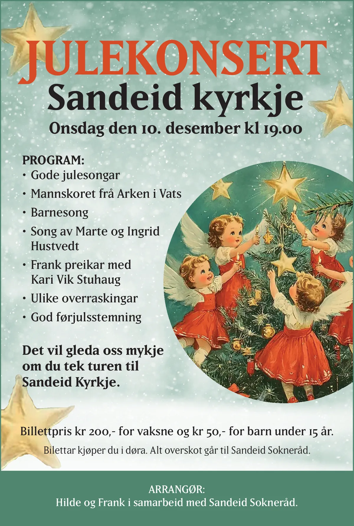 Program: - Gode julesongar - Mannskoret frå Arken i Vats - Barnesong - Song av Marte og Ingrid Hustvedt - Frank preikar med Kari Vik Stuhaug - Ulike overraskingar - God førjulsstemning Det vil gleda oss mykje om du tek turen til Sandeid Kyrkje.