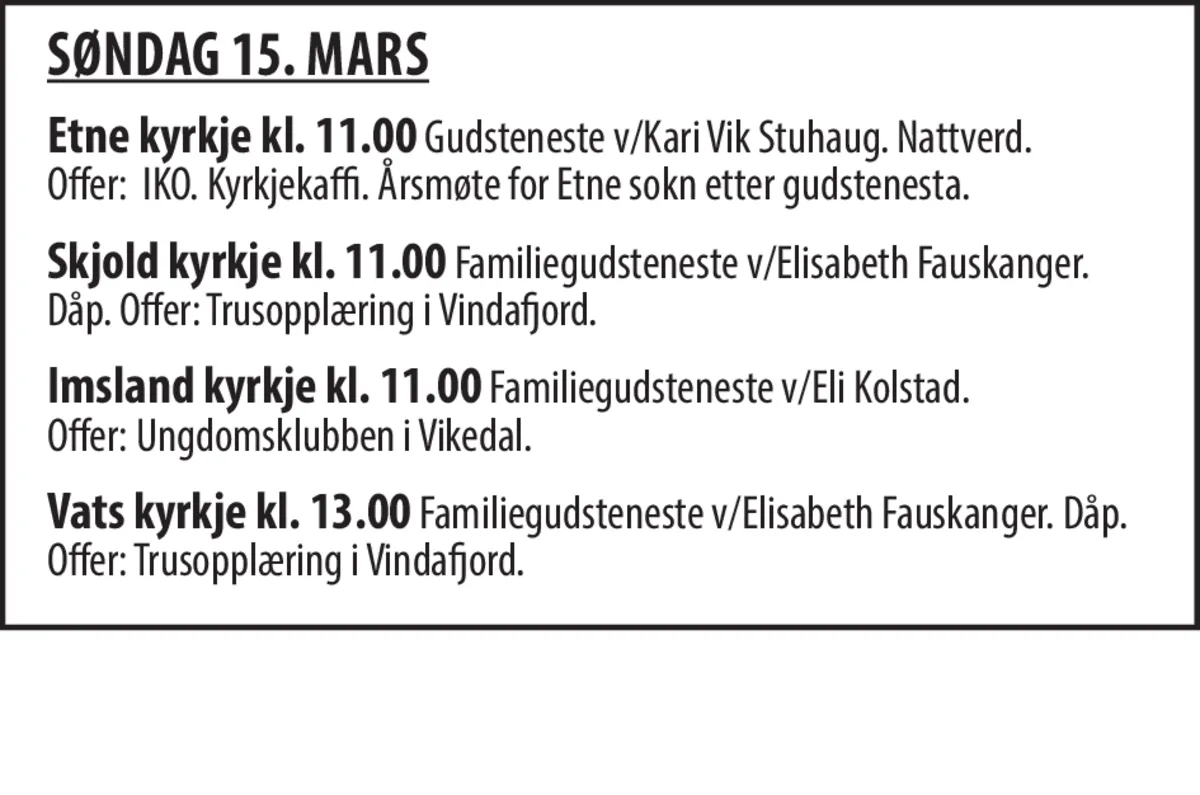 Gudsteneste v/Kari Vik Stuhaug. Nattverd. Offer: IKO. Kyrjekaffi. Årsmøte for Etne sokn etter gudstenesta.