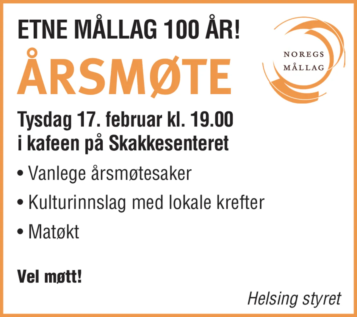 Etne mållag 100 år! Vanlege årsmøtesaker. Kulturrinnslag med lokale krefter. Matøkt